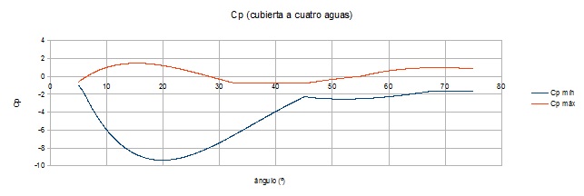 | - Cubiertas a cuatro aguas: no se consideran ángulos menores de 5º, que corresponderían a cubiertas plantas, ni superiores a 75º, que serían paramentos verticales. no se indica barlovento o sotavento, porque al ser un agua sola, Cp min indica sotavento y Cp max barlovento. |